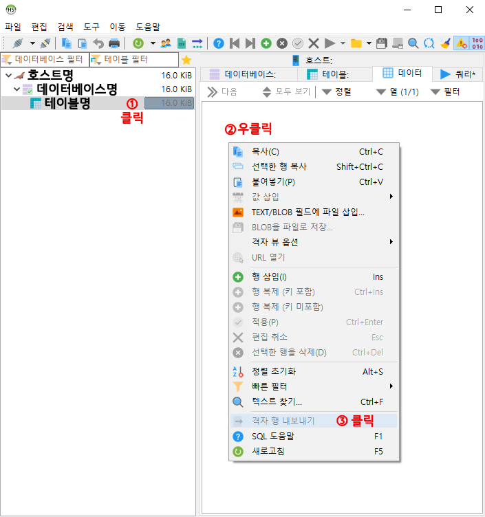 ⑥ 드롭다운 버튼을 클릭하고 데이터베이스를 선택한다.