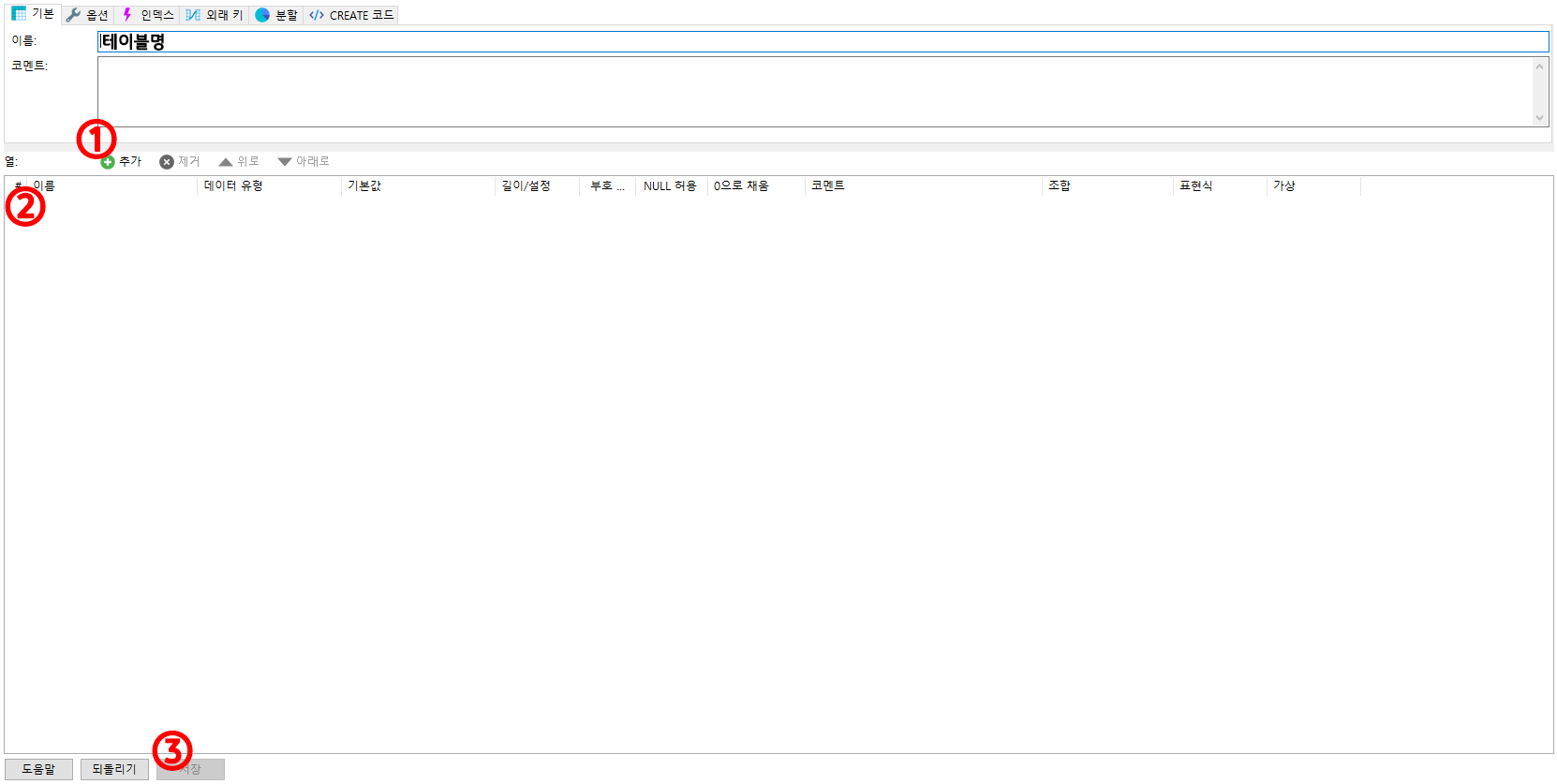 열의 이름을 입력한다. 열이 고유번호인 경우, 우클릭 > 새 인덱스 생성 > PRIMARY 로 설정한다.