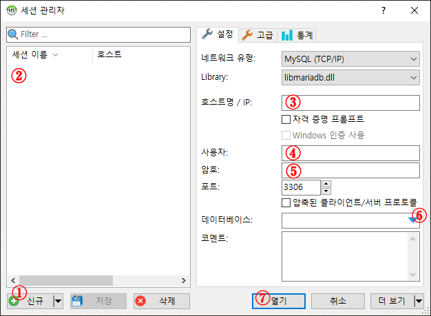 ※ 이후에 실행하면 ②번 영역에 저장된 세션을 선택해서 데이터베이스에 접속한다.
